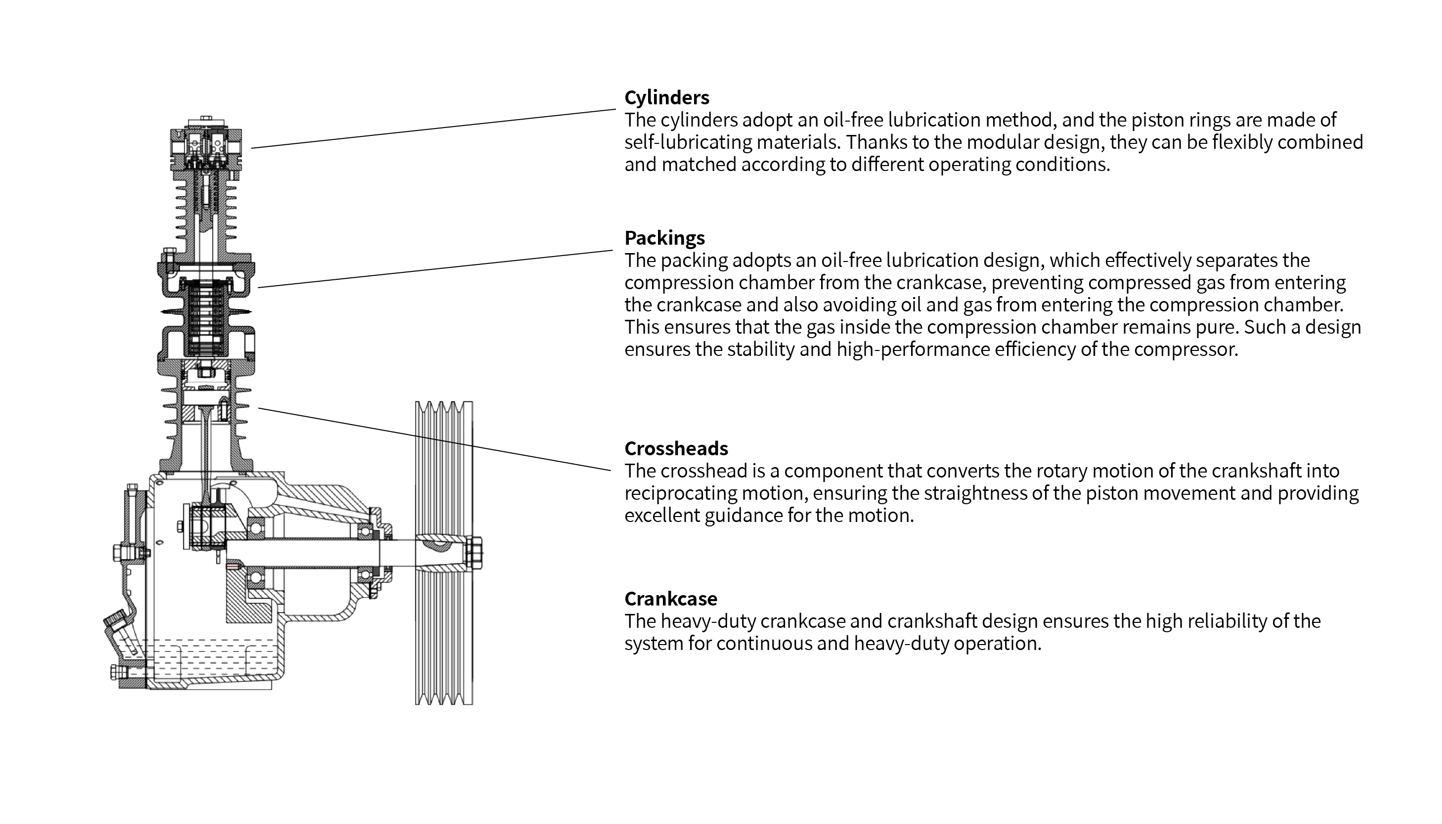 *The compressor adopts a crosshead and packing design, with the crankshaft, connecting rod, and crosshead lubricated with oil, while the compression chamber and packing are oil-free lubricated.